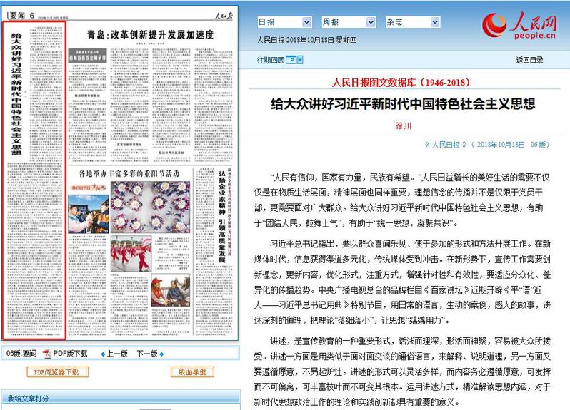 2018年10月18日,《人民日报》“要闻版”刊登taptap点点taptap点点官方网站党总支书记徐川的文章《给大众讲好习近平新时代中国特色社会主义思想》,现转发全文。