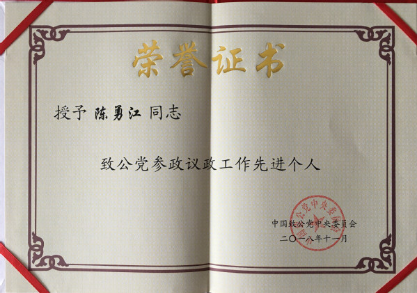 参政议政、建言献策是党外代表人士的重要政治职责。作为致公党党员,陈勇江教授积极履职尽责,先后主持调研课题15项,获致公党江苏省委优秀调研报告15项,形成全国政协会议主题发言2项、全国政协提案4项、全国政协集体提案4项、江苏省政协常委会议发言3项、江苏省政协主席会议发言2项、江苏省政协会议书面发言3项、江苏省政协会议口头发言2项、江苏省政协提案8项等调研成果。其中,《关于长三角科技合作与科技创新的建议》、《关于健全突发公共事件应急管理机制建设的调研报告》等分别获致公党中央参政议政优秀调研报告和参政议政优秀成果,得到党和国家领导人的批示,今年撰写的《建立健全军民科技融合发展的体制机制》荣获致公党江苏省委“汇智论坛”优秀成果一等奖。