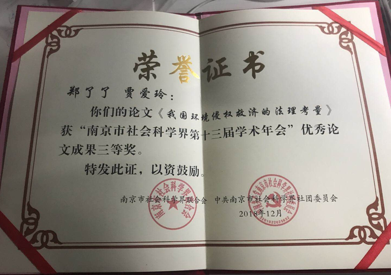 12月19日,2018年南京市哲学社会科学界第十三届学术年会在南京召开,本届年会的主题为“建设创新名城,实现高质量发展”。江苏省社科联党组书记、常务副主席刘德海出席会议并作主旨演讲。市社科类社会团体、区社科联、高校社科联负责人及获奖论文作者代表150余人参加会议。会上对学术年会优秀论文成果和作者进行表彰。本届学术年会共收到征文200余篇,经编委会最终评审,42篇论文获奖并入选核心期刊《南京社会科学》专刊,其中一等奖4篇,二等奖14篇,三等奖24篇。taptap点点博士生郑了了撰写的《我国环境侵权救济的法理考量》喜获三等奖。