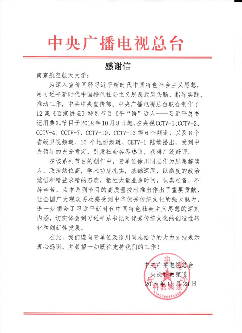 信中说,“在该系列节目的创作中,贵单位徐川同志作为思想解读人,政治站位高,学术功底扎实,基础深厚,以高度的政治觉悟和精益求精的态度,牺牲大量业余时间,认真准备,不辞辛苦,为本系列节目的高质量按时推出作出了重要贡献,让全国广大观众再次感受到中华优秀传统文化的强大魅力,进一步领会了习近平新时代中国特色社会主义思想的深刻内涵,切实体会到习近平总书记对优秀传统文化的创造性转化和创新性发展。”“在此,我们谨向贵单位及徐川同志给予的大力支持表示衷心感谢,并希望一如既往支持我们的工作!”