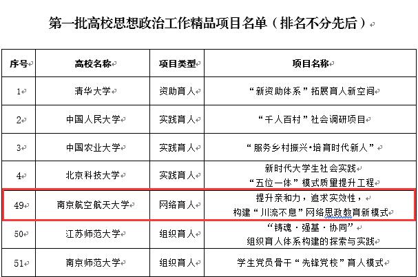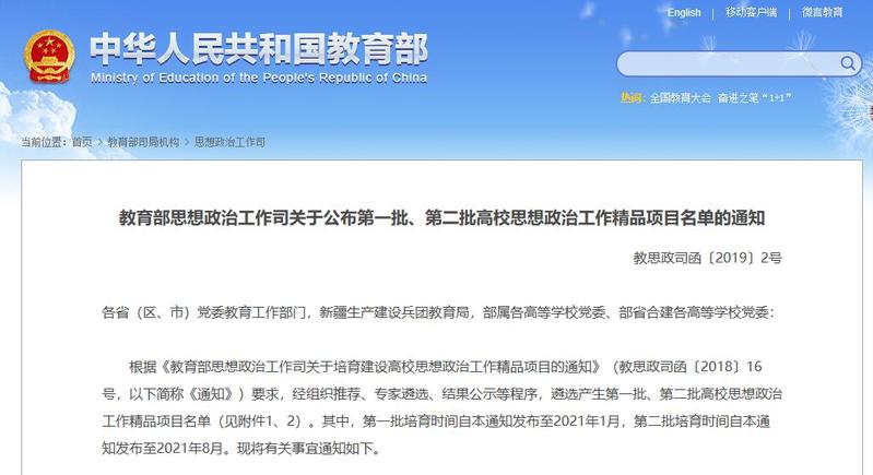 据悉,高校思想政治工作精品项目旨在深入学习贯彻习近平新时代中国特色社会主义思想和党的十九大精神,贯彻落实习近平总书记在北京大学师生座谈会上的重要讲话精神,推进全国高校思想政治工作会议精神落地见效,促进高校思想政治工作质量提升工程深入实施,着力培养担当民族复兴大任的时代新人。项目主要分为课程育人、科研育人、实践育人、文化育人、网络育人、心理育人、管理育人、服务育人、资助育人、组织育人等类型,首批高校思想政治工作精品项目共有100个。