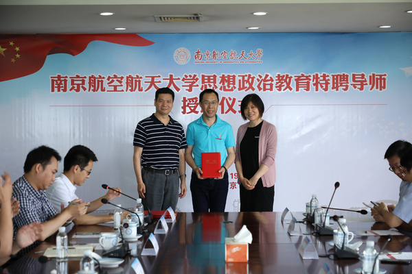 郑永安和寇芳为参会的“劳模”思想政治教育特聘导师颁发聘书并佩戴校徽。江苏省劳动模范杨春泽代表受聘思政导师发言,表示南航是非常令人向往的高校,能加入其中是一份荣誉和责任,各位思政导师将不辱使命,帮助学生培养正确的世界观人生观价值观。