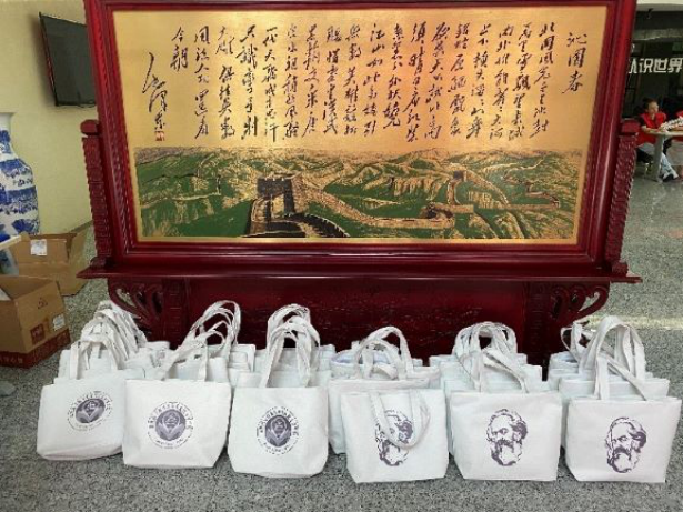 在迎新氛围营造和入学纪念品的设计中,学院精心设计,将思政教育元素融入其中。欢迎展板上展示了马恩经典著作语录,在小收纳纸盒盒面分别印制了习近平总书记关于学习修身、勤俭节约、身心健康等方面的论述,对应给学生赠送了《习近平新时代中国特色社会主义思想三十讲》书籍、U盘、小零食、口罩、净手凝胶、特色帆布袋等纪念品,发放了“节约粮食、光盘行动”倡议书。