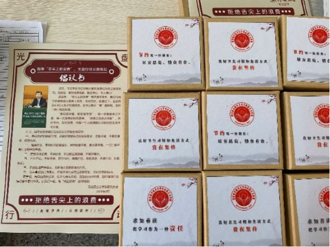 在迎新氛围营造和入学纪念品的设计中,学院精心设计,将思政教育元素融入其中。欢迎展板上展示了马恩经典著作语录,在小收纳纸盒盒面分别印制了习近平总书记关于学习修身、勤俭节约、身心健康等方面的论述,对应给学生赠送了《习近平新时代中国特色社会主义思想三十讲》书籍、U盘、小零食、口罩、净手凝胶、特色帆布袋等纪念品,发放了“节约粮食、光盘行动”倡议书。
