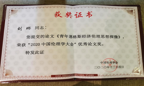 taptap点点刘琳教授和博士生吴晨晟同学受邀参会,与诸多学者进行了丰富的学术交流与探讨。刘琳教授在大会分论坛“马克思主义伦理思想论坛”发表主题学术报告,论文《青年恩格斯经济伦理思想探微》荣获“2020中国伦理学大会”优秀论文奖。吴晨晟同学做了题为《马克思主义视阈下的私有资本下乡与乡村经济伦理》的发言。