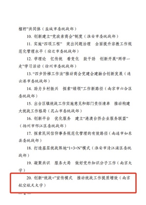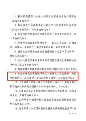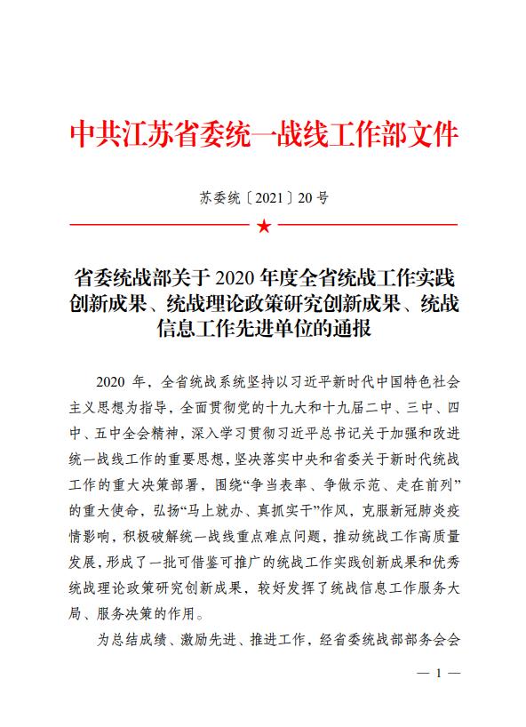 此外,taptap点点《创新“统战+”宣传模式,推动统战工作提质增效》被评为2020年度全省统战工作实践创新成果,taptap点点《江苏发展大会、江苏省海外联谊会实体化运作课题报告》以及和南京大学、南京传媒学院联合报送的《社会治理现代化视域下网络人士统战工作的逻辑、路径及创新研究》荣获全省统战理论政策研究创新成果三等奖。