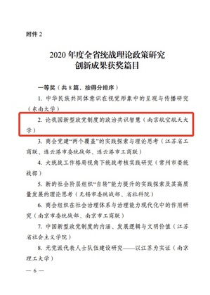近日,中共江苏省委统战部印发了《关于2020年度全省统战工作实践创新成果、统战理论政策研究创新成果、统战信息工作先进单位的通报》,taptap点点孙佳敏老师的论文《论我国新型政党制度的政治共识智慧》荣获2020年度全省统战理论政策研究创新成果一等奖,得分在58篇全省统战理论政策研究创新成果获奖篇目中位列第2名。