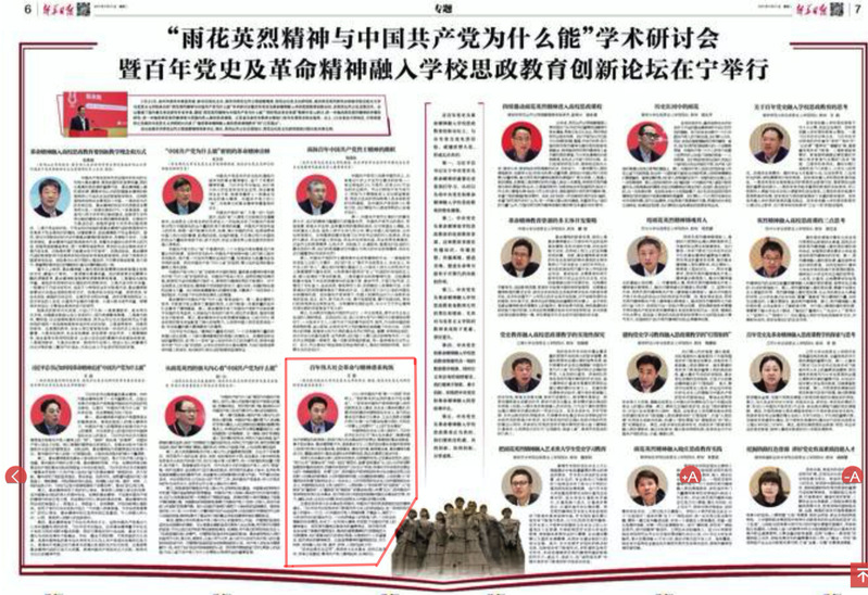 4月27日,新华日报第6-7版“‘雨花英烈精神与中国共产党为什么能’学术研讨会暨百年党史及革命精神融入学校思政教育创新论坛在宁举行”专题刊登了taptap点点院长、博士生导师王智教授的发言《百年伟大社会革命与精神谱系构筑》,现将全文转发如下: