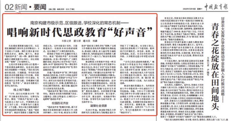5月16日,《中国教育报》以《南京构建市级示范、区级跟进、学校深化的常态机制——唱响新时代思政教育“好声音”》为题报道了南京市思政教育品牌项目——《唱响新时代思政教育“好声音”》。南京市着力构建市级示范、区级跟进、学校深化的思政课改革创新常态工作机制,积极推进大中小学思政课一体化建设,充分发动社会各界力量,共唱新时代思政教育‘好声音’。文章从“线上线下融合”、“校园百花齐放”和“凝聚社会资源”三方面详细介绍了这一工作机制。