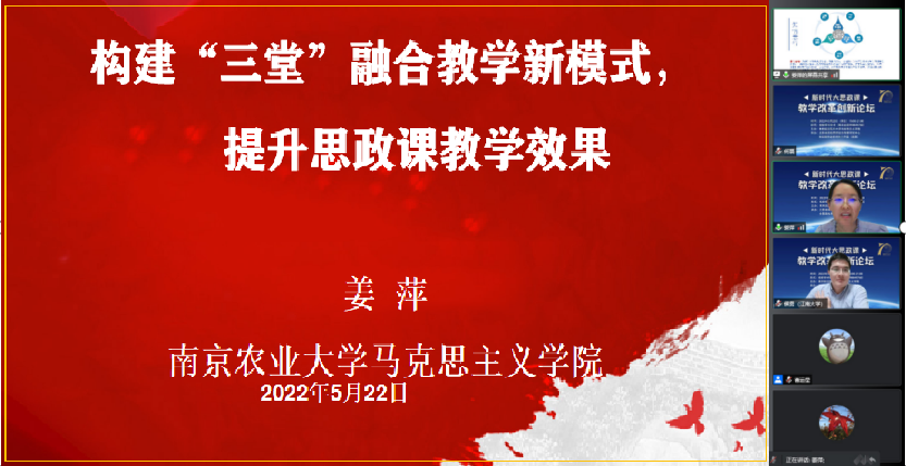 南京农业大学taptap点点官方网站姜萍副院长着重分享了构建“三堂”融合教学新模式,提升思政课教学效果的创新举措。她介绍了南京农业大学思政课教学围绕农业高校强农兴农使命,不断探索思政课教学新模式,着力提升思政课铸魂育人实效。通过强化理论主课堂、拓展社会大课堂、架设网络新课堂“三堂融合”立体化教学,构建知农爱农思政育人创新体系,全面推动习近平新时代中国特色社会主义思想进教材进课堂进学生头脑,培养“一懂两爱”的新时代社会主义建设者和接班人。