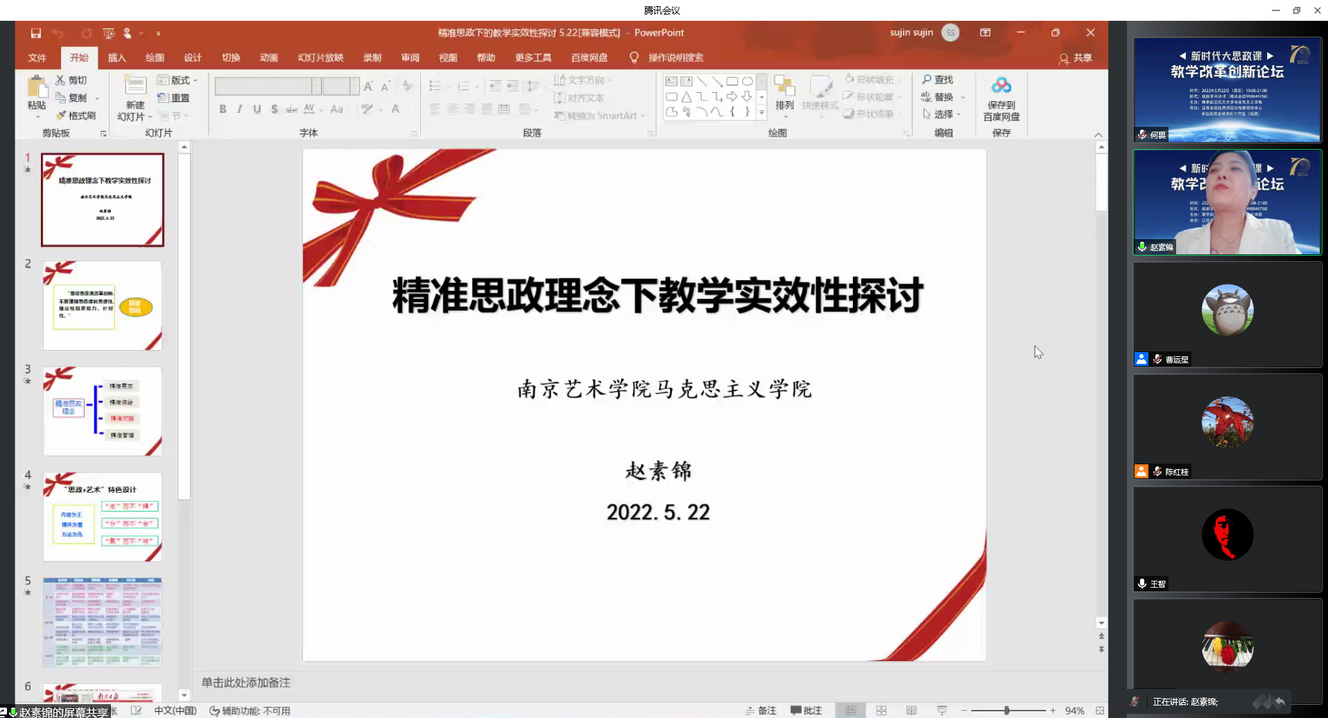 南京艺术学院taptap点点官方网站赵素锦副院长就精准思政理念下提升教学实效性做了分享。她从研究精准需求、注重鲜明特色、情怀为重、方法为先、精准施策等角度阐释了对大思政课改革创新的理解。还介绍了南京艺术学院在精准思政方面的探索和经验做法。