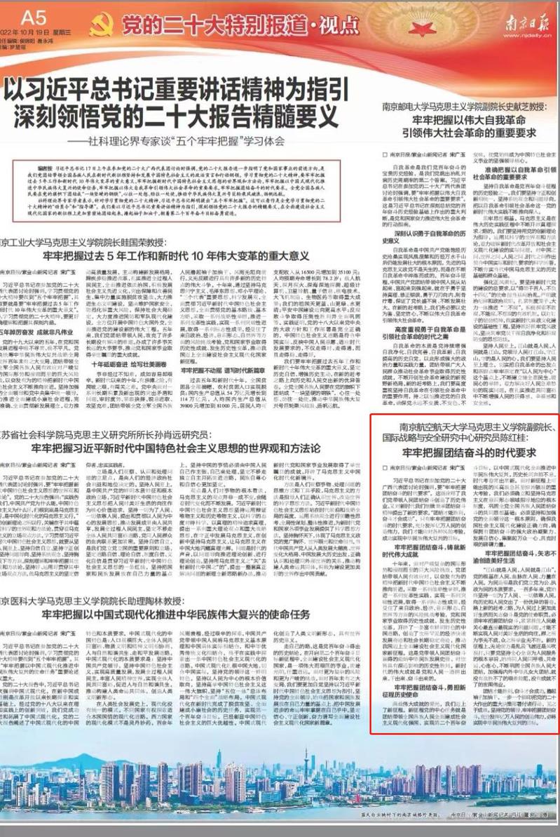 10月19日,《南京日报》第A5版“党的二十大特别报道•视点”栏目刊登了taptap点点陈红桂副教授的理论文章《牢牢把握团结奋斗的时代要求》,现将全文转发如下: