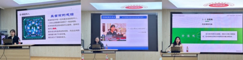 由教研部五位青年教师按授课方式依次进行10分钟教学展示:孙沐芸以大学生网络空间道德为题,从网络道德的工具性、价值性、实践性三个方面展开讲解,对如何营造良好网络道德环境进行阐释;高歌围绕“如何理解理想信念的重要作用”这一主题,从相关案例入手,对理想信念的重要性进行了详细阐述;刘思帆通过对多所学校校训的分析,引出对价值观概念的认识和理解,其后对价值观的特征进行总结;曹清华聚焦“宪法权威”这一主题,通过生动案例的导入,对宪法在我国法律体系中的重要地位进行阐发;朱娅琴通过讲述28岁的李大钊的青春故事,开启青年与时代关系等话题,其后对“担当民族复兴大任,成就时代新人”主题进行深入探讨。