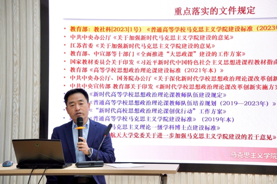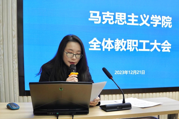 党委副书记阙愚代表学院党委汇报学院2023年全面从严治党的工作情况。阙愚指出,2023年在校党委的领导下,马院党委坚持以习近平新时代中国特色社会主义思想为指导,以习近平总书记致南航重要勉励精神为遵循,全面落实学校第十七次党代会精神,扎实开展学习贯彻习近平新时代中国特色社会主义思想主题教育,为学院高质量发展提供坚强政治保障。并从政治建设、思想建设、组织建设、作风建设、纪律建设、推进反腐败工作、推进党建与事业发展“一融双高”具体做法以及存在问题与改进措施等七个方面进行全面从严治党述职。阙愚向全体教师报告了学院党费的使用情况。
