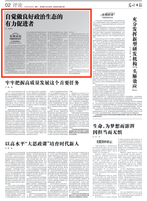 3月25日,《光明日报》第02版“光明论坛”栏目刊发了江苏省习近平新时代中国特色社会主义思想研究中心taptap点点官方网站基地研究员王晓庆的理论文章《自觉做良好政治生态的有力促进者》,现将全文转发如下: