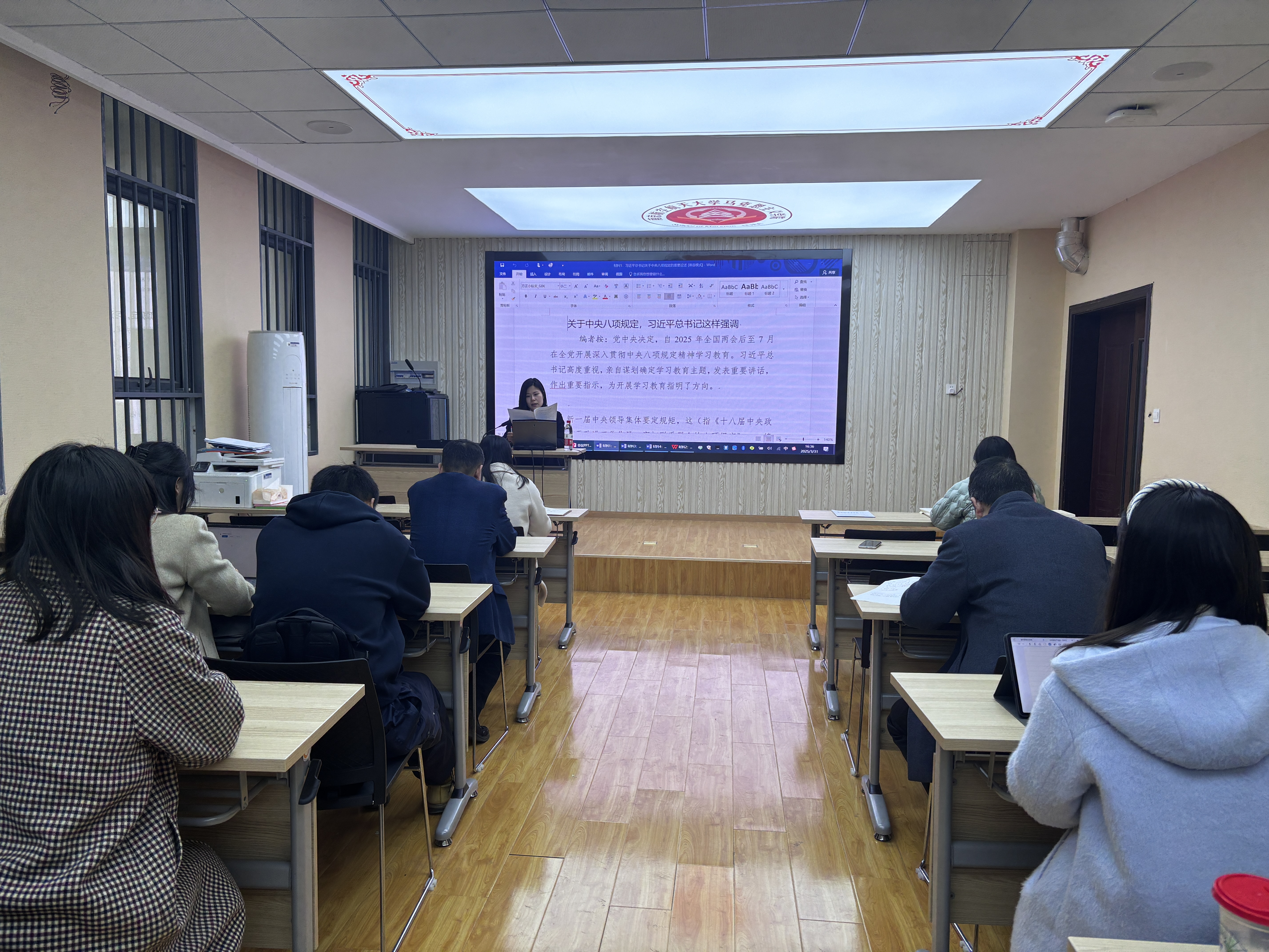 学院纪检委员徐军领学《中央政治局关于改进工作作风、密切联系群众的八项规定》,并传达学习学校2025年党的建设暨党风廉政建设工作会议精神。