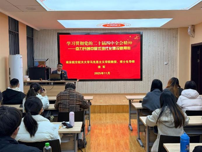 专题学习环节,徐军以《学习领会党的二十届四中全会精神——奋力开创中国式现代化建设新局面》为题,围绕“十四五”期间我国经济社会发展的重大成就、系统把握“十五五”规划的精髓要义和主要内容、进一步提高党对中国式现代化建设的领导水平三方面内容授课。徐军还针对“清廉马院”建设提出具体指导,鼓励各学生党支部将廉洁教育融入党建活动、学术研讨、业务能力培养全过程。